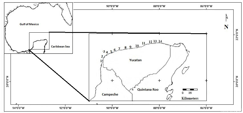 We express our gratitude to the Universidad Nacional Autónoma de México which supported the Program for Projects for the Innovation and Improvement of Education PAPIME PE207317, which enabled us to carry out this project. Also, our thanks to Dr. Xavier Chiappa Carrara, Chairman of the scientific network RECORECOS (Red para el Conocimiento de los Recursos Costeros del Sureste) for supporting logistics. Finally, we thank Dr. Armin Tuz, M.Sc. Johnny Valdez, and the students Mariana Álvarez, Fernando Ayuso, Valery Ávila, and Karla Durán for their support in the field.