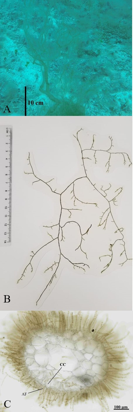 Description. Thallus with a filamentous form, soft and mucilaginous entangled masses, up to 45 cm long, color light brown and somewhat greenish (Figure 2A-B). The axis is cylindrical, and the uniaxial structure is visible proximal to the apical cells. Branching is abundant, up to three orders, alternate to irregular. The internal structure is differentiated between a medulla (with 2-4 rows of colorless cells) and cortical cells. The main and older axes become hollow with a diameter between 0.3 - 0.6 mm (Figures 2C, 3A); the younger branches have a solid central axis, thin, cylindrical and often entangled, 0.1 - 0.3 mm in diameter (Figure 3C). The medullary cells are from 55-120 by 30-60 μm in diameter. The cortical cells are 12-25 by 12-45 μm in diameter.