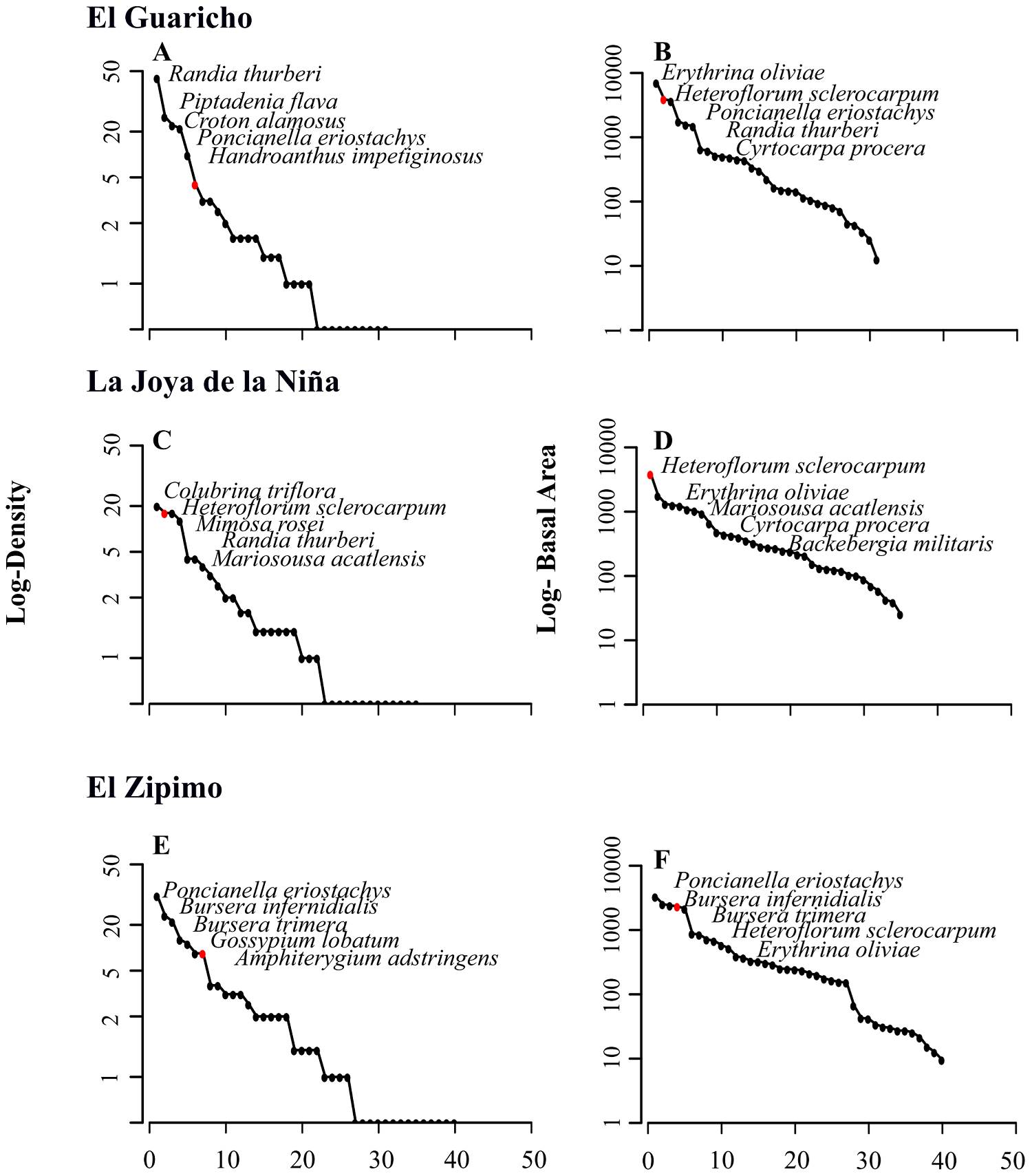 Figure 2 Species-rank curves based on species density (left) and basal area (right) for species assemblages in the Ejido Llano de Ojo de Agua, Churumuco municipality. Curves correspond to each of the three studied sites. The top five species are shown in each case; the rank of Heteroflorum sclerocarpum is indicated with a red ellipse. Log data were obtained using the logarithm of abundance/basal area using the logarithm base 10.