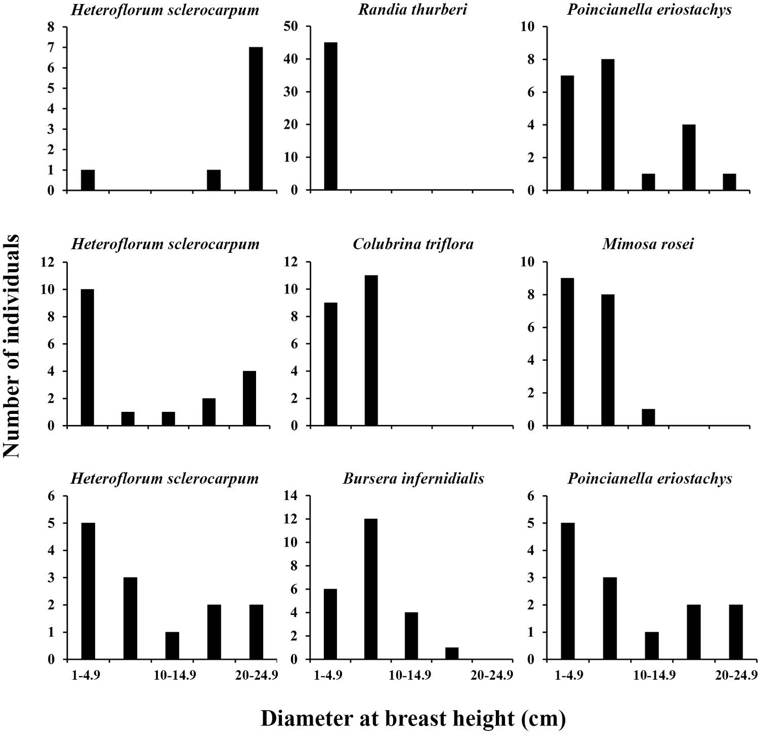 The top five species of each site were distinct between the two types of species rank curves, although this dissimilarity was stronger at El Guaricho since it only shared Poincianella eriostachys (Figure 2). In this last site, Heteroflorum presented the higher number of individuals in the category with the highest DBH (20-24.9 cm); in contrast, the other two sites had the highest frequencies towards the classes with the lowest DBH values (Figure 3). The other species included in this figure showed all (Randia thurberi) or an important number of individuals grouped in the two firsts DBH categories, and often lacked of individuals in the category with bigger individuals (e.g., Colubrina triflora or Mimosa rosei).