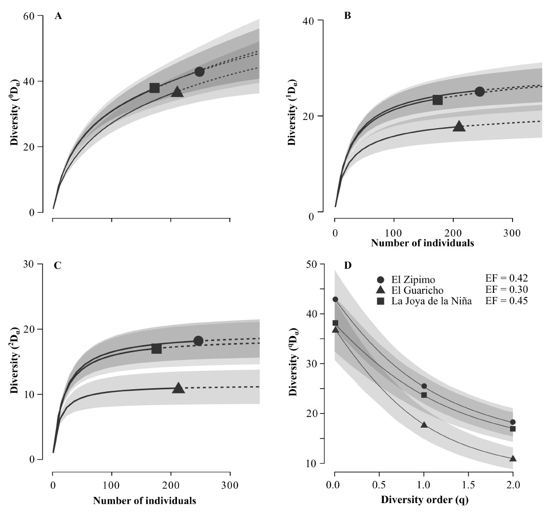 Figure 4 Diversity estimated with different sample sizes (number of individuals; A-C) for different q values. Symbols represent observed diversity values in each site sampled in tropical dry forest of the Ejido Llano de Ojo de Agua, while solid and dotted lines represent interpolated and extrapolated diversity values, respectively. D) Diversity profiles for each site with confidence intervals estimated for q = 0, 1, and 2. Number of simulations: A-C = 100 and D = 10; Alpha = 0.05.