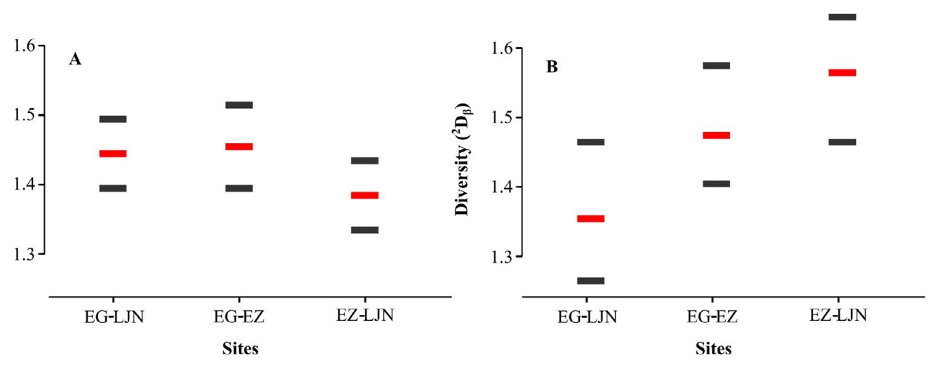 Figure 5 True beta diversity between pairs of sites for orders 0 (A) and 2 (B). The red bars indicate the average estimate, while the black bars designate the confidence interval given by the maximum and minimum estimates (Number of simulations = 100; Alpha = 0.05). EG, El Guaricho; LJN, La Joya de la Niña; EZ, El Zipimo.