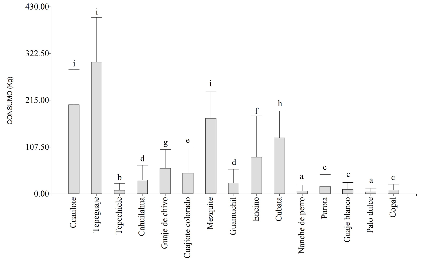 Figura 2 Diferencias en el consumo de leña a nivel de especies. Rangos promedio referidos por letras diferentes entre barras indican diferencias significativas (Kruskal Wallis, P < 0.05).