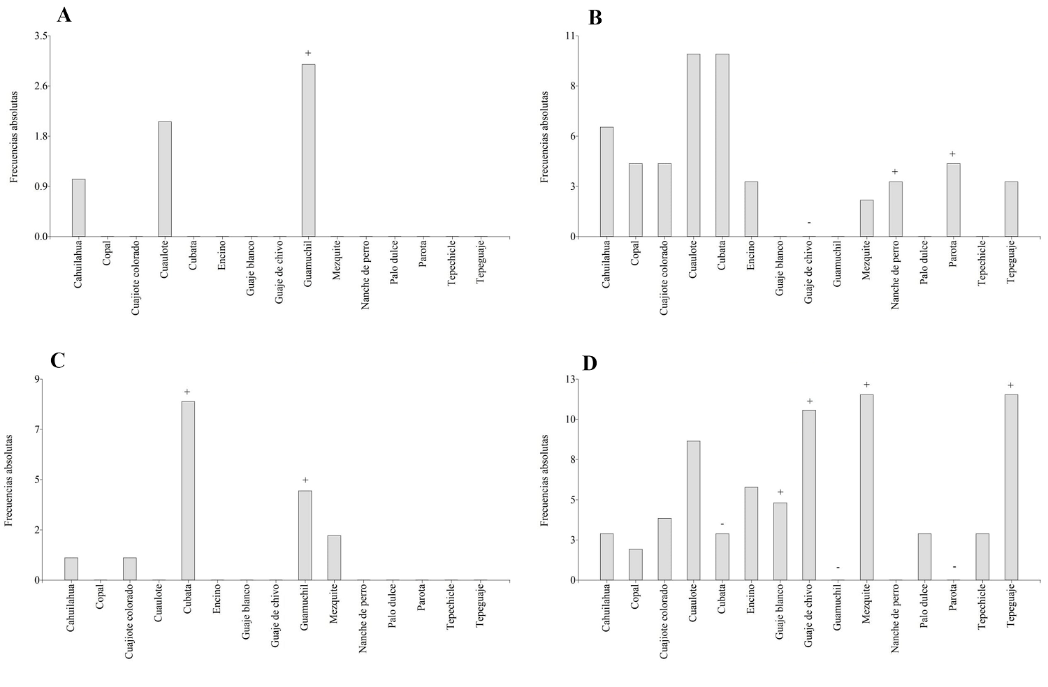 Figura 3 Peso relativo de cada especie por unidad productiva (χ2 = 125.22, P < 0.0001): patio (A), milpa (B), potrero (C) y monte (D). Los símbolos +/- muestran las categorías de peso que significativamente se encontraron en mayor o menor proporción entre las unidades productivas tradicionales estudiadas (Residuos Ajustados de Haberman).