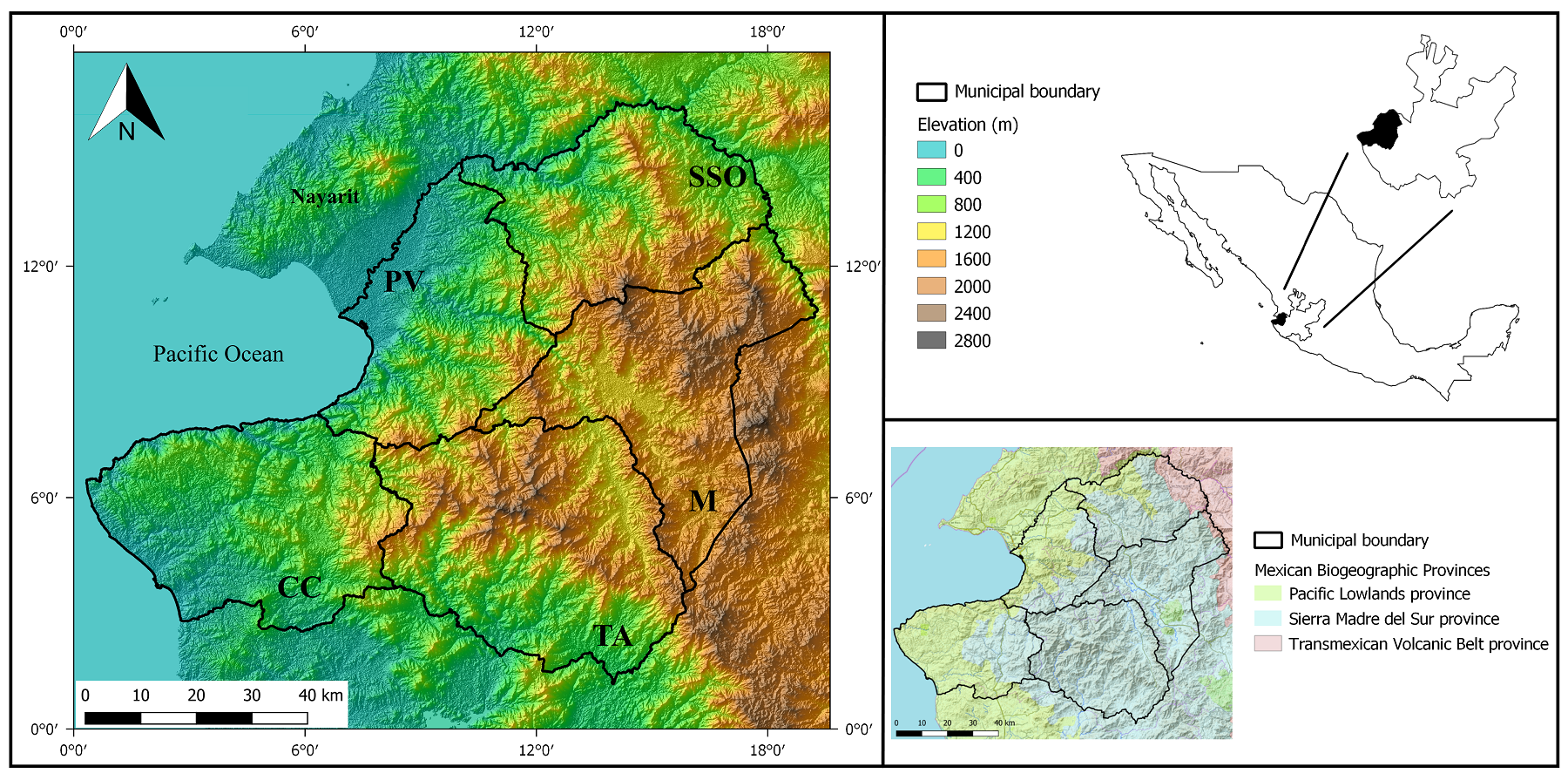 Figure 1 Location of the Western Sierra-Coast region in the state of Jalisco. Municipalities: CC = Cabo Corrientes; M = Mascota; PV = Puerto Vallarta; SSO = San Sebastián del Oeste; TA = Talpa de Allende.