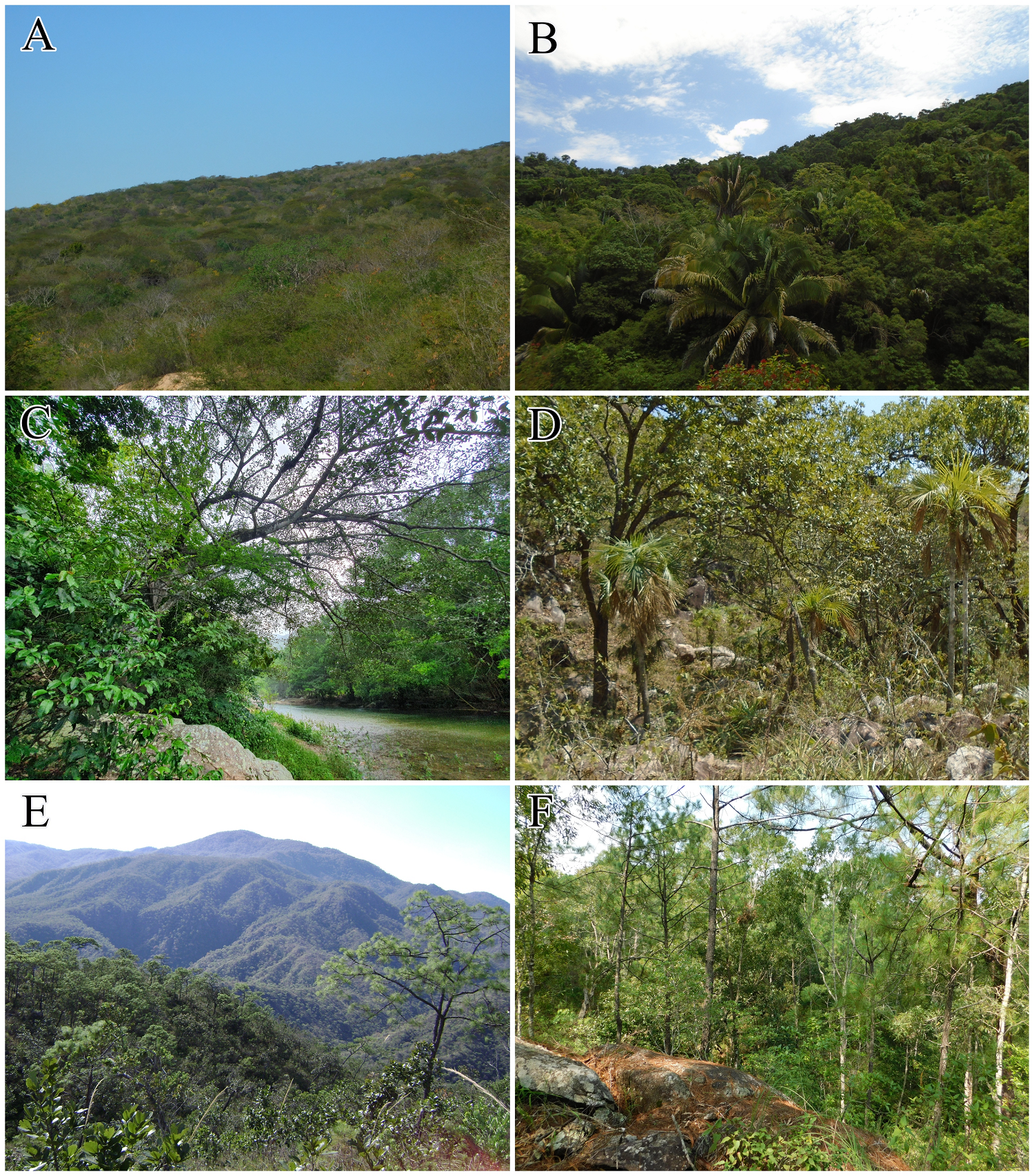 Figure 2 Vegetation types present in the Western Sierra-Coast region. A) tropical deciduous forest, B) tropical subdeciduous forest, C) riparian forest, D) oak forest, E) pine-oak forest, and F) a gorge of cloud forest.