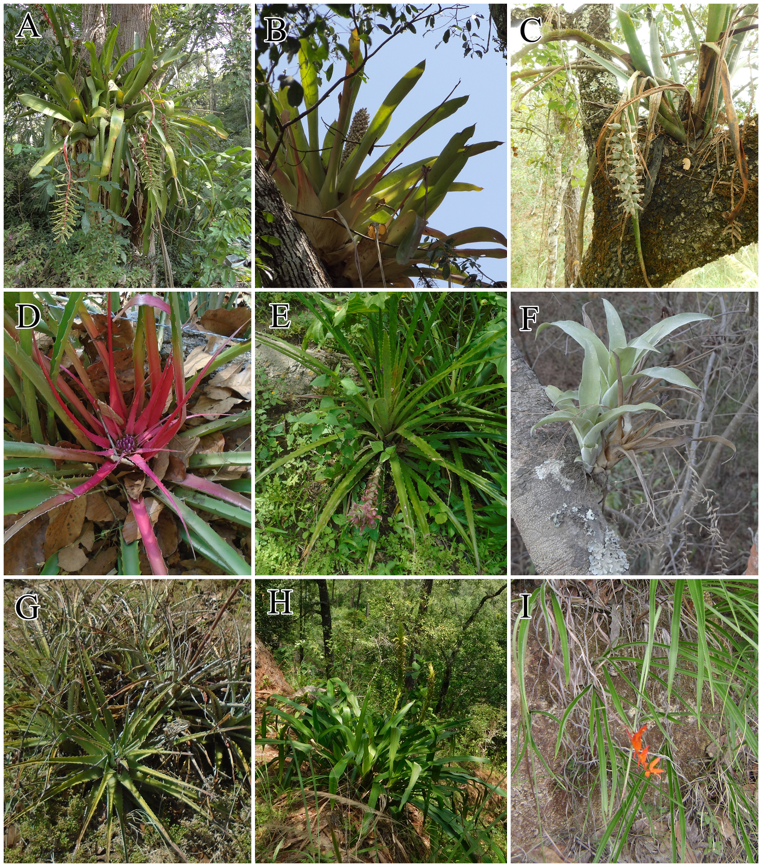 Figure 3 Distribution of the Bromeliaceae in the Western Sierra-Coast region of Jalisco. A) Aechmea bracteata, B) A. novoae, C) Billbergia pallidiflora, D) Bromelia karatas, E) B. pinguin, F) Catopsis nutans, G) Hechtia ibugana, H) Pitcairnia abscondita, and I) P. compostelae. (Photographs A, B, and F by A. Espejo-Serna; C, D, E, G, H, and I by A. Flores-Argüelles).