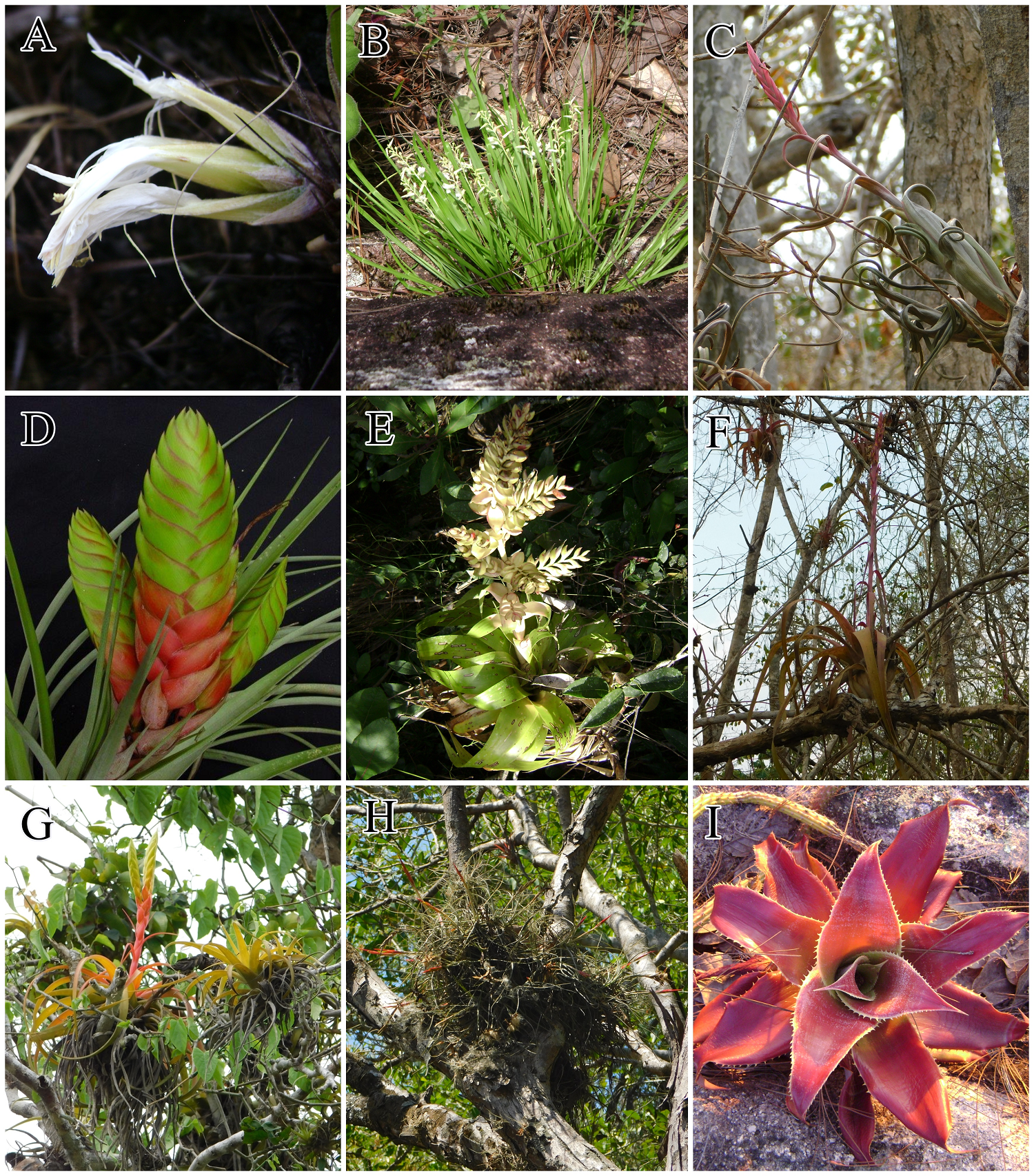Figure 4 Distribution of the Bromeliaceae in the Western Sierra-Coast region of Jalisco. A) Pitcairnia heterophylla, B) P. singularis, C) Tillandsia intermedia, D) T. jaliscomonticola, E) T. mooreana, F) T. polystachia, G) T. rothii, H) T. schiedeana, and I) Ursulaea tuitensis. (Photographs D by A. Espejo-Serna; A, B, C, E, F, G, H, and I by A. Flores-Argüelles).