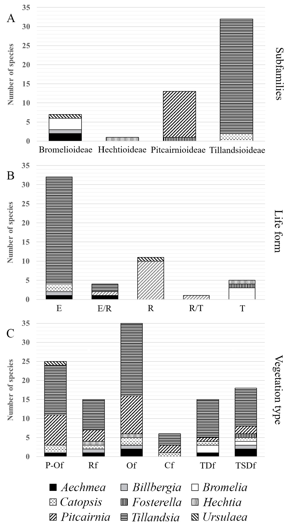Figure 5 Distribution of the Bromeliaceae in the Western Sierra-Coast region of Jalisco by A) subfamilies; B) life form: E = epiphyte, E/R = epiphyte and rupicolous, R = rupicolous, R/T = rupicolous and terrestrial, T = terrestrial; C) vegetation type: P-Of = Pine-Oak forest, Rf = Riparian forest, Of = Oak forest, Cf = Cloud forest, TDf = Tropical Deciduous forest, TSDf = Tropical Subdeciduous forest.