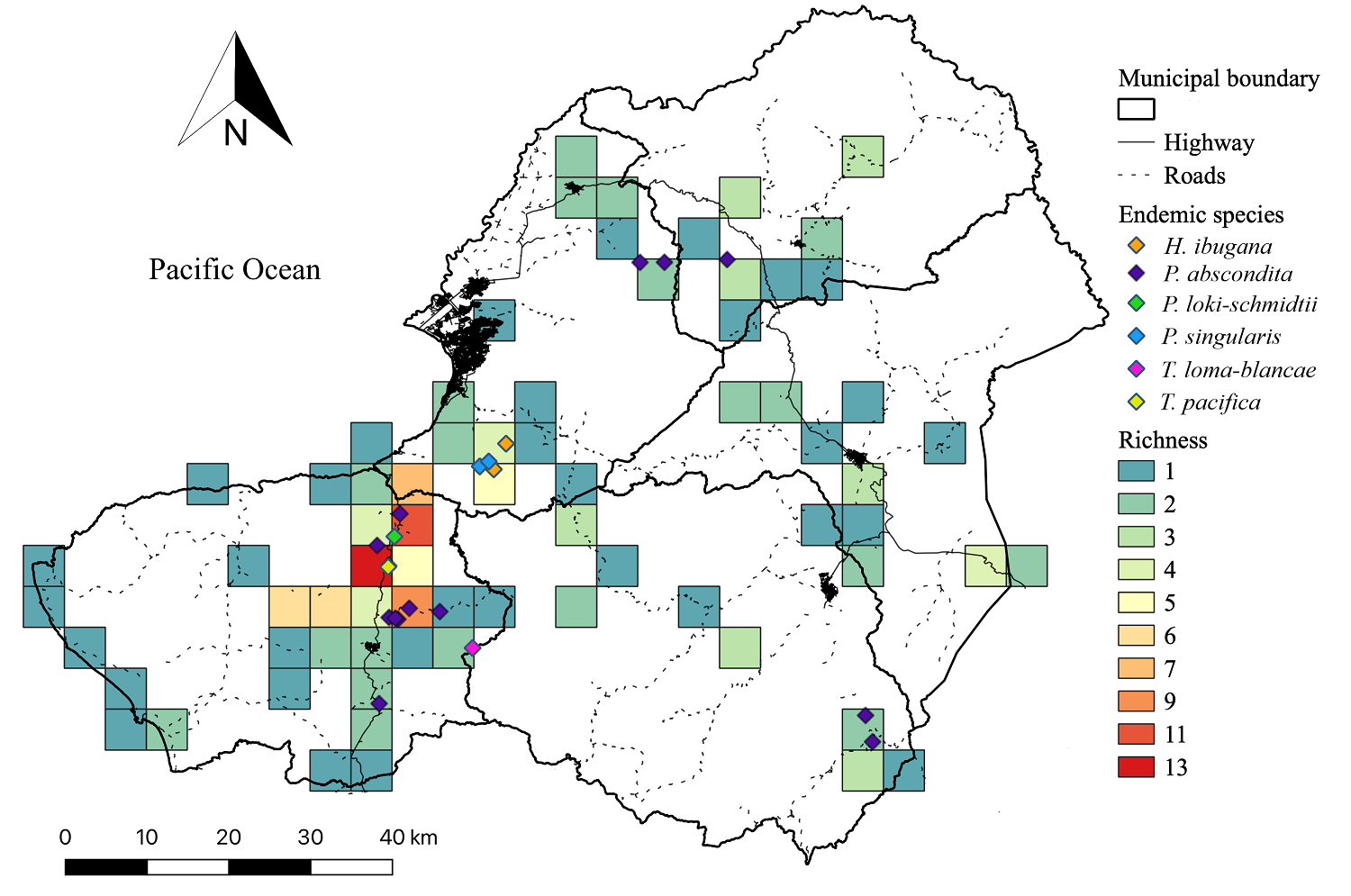 Figure 6 Richness of the Bromeliaceae in the Western Sierra-Coast region of Jalisco. The cell size is 5 × 5 km. Endemic species records (Hechtia ibugana, Pitcairnia abscondita, P. loki-schmidtii, P. singularis, Tillandsia lomablancae, and T. pacifica) are included.