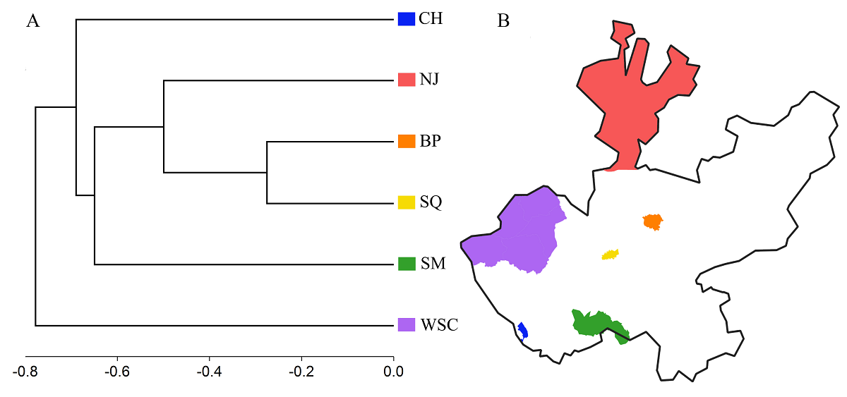 Figure 7 Affinity of the bromeliad flora from the Western Sierra-Coast region of Jalisco with other regions of the state. A) Cluster analysis (UPGMA); B) location of the regions along Jalisco state. BP = Bosque La Primavera; CH = Chamela-Cuixmala; NJ = North Jalisco; SM = Sierra de Manantlán; SQ = Sierra de Quila and WSC = Western Sierra-Coast.