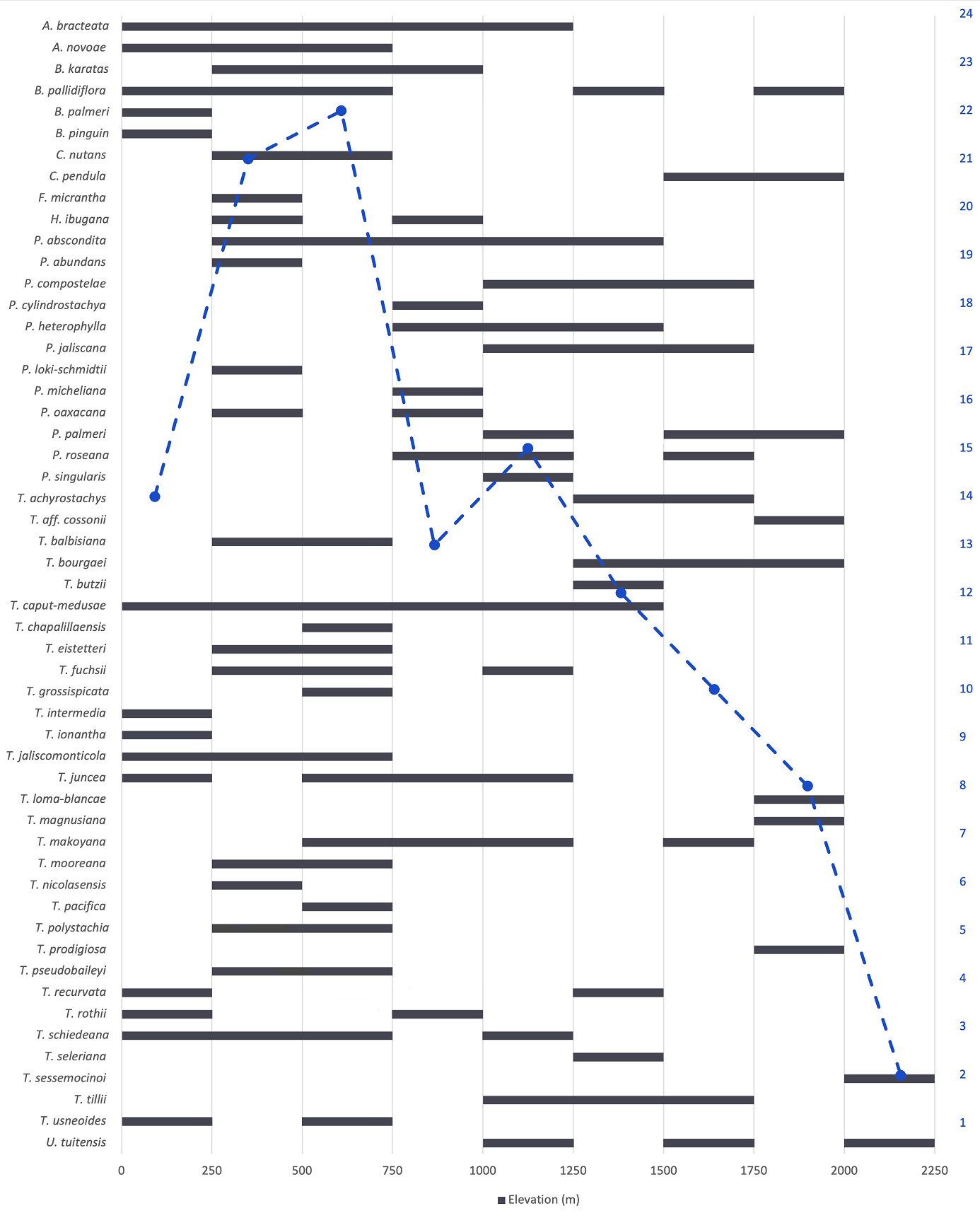 Figure 8 Distribution of the Bromeliaceae in the Western Sierra-Coast region of Jalisco by altitudinal range (the blue line indicates the total number of species in each altitudinal belt of 250 m).