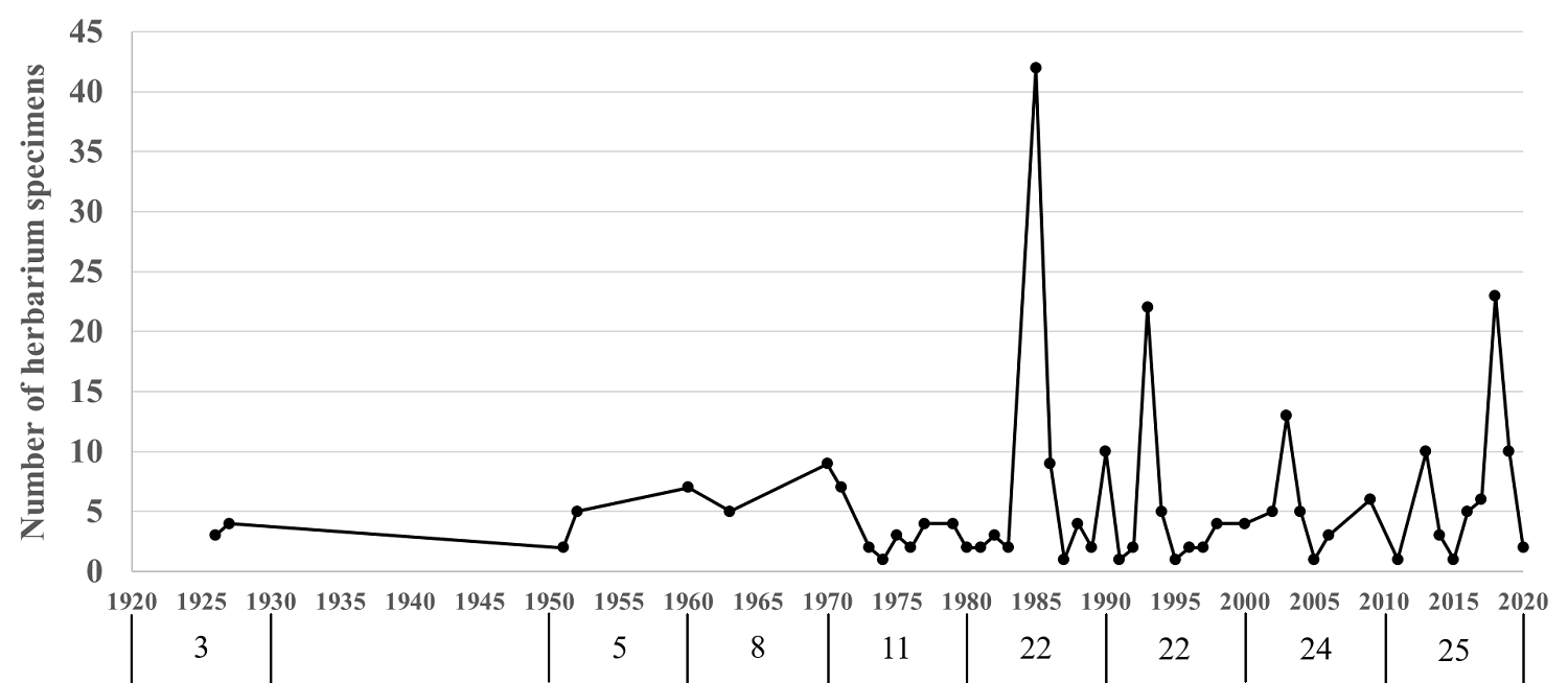 Cabo Corrientes municipality has the highest number of species (35), as well as records of herbarium specimens (164) (Figure 9), while Mascota and San Sebastián del Oeste have the lowest records of species, with 22 each, as well as herbarium specimens, with 23 and 18 respectively. More than half of the species (56 %) were only located in one municipality, where Cabo Corrientes has the highest number of exclusive species (16), and Pitcairnia abscondita Flores-Arg., López-Ferr., Gonz.-Rocha & Espejo (Flores-Argüelles et al. 2022b) was the only taxon found in all municipalities (Supplementary material). The oldest collection recorded for the region was made in 1926 by the Mexican American Ynes Mexia and it was a specimen of Aechmea bracteata. In the decade of the 80s the largest number of collections were made, with 1985 excelling with almost all the records, mainly done by Magaña-Rueda (1986) (Figure 9). The decade of the 2010s has the second highest collection activity and the highest number of species with 25.