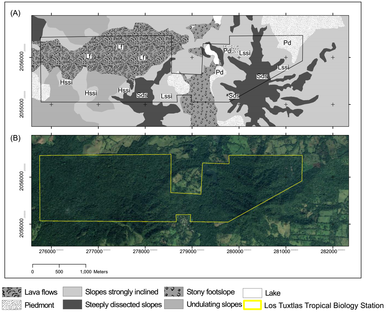 Environmental heterogeneity characterization. We stratified the study area based on the five LUs delimited by Navarrete-Segueda et al. (2021). These discrete units are based on the systematic integration of environmental components such as geology, relief, and soil (Zinck et al. 2016). This approach has been used to stratify the environmental mosaic and the potential habitats in the study area (Navarrete-Segueda et al. 2021) as well as in other Neotropical rainforests (Clark et al. 1995, Brown et al. 2013, Denslow et al. 2019). Four of the five LUs were associated with cinder cones (late Tertiary and early Quaternary), that differ in inclination, elevation, microclimate, and their soils, which were formed from volcanic ash. The fifth landscape unit corresponds to a landscape associated with Holocene volcanic events and is characterized by shallow stony soils (Table 1). The selected LUs are representative nearly of 75 % of the landforms of the LTBS (640 ha). In each of the LUs, three plots of 20 × 50 m (0.1 ha) were established, covering a total sample area of 1.5 ha. Plots on steep slopes were oriented transverse to the slope to minimize the effect of topographic variation. Estimated inter‐site distances ranged between 400 and 4,550 m.