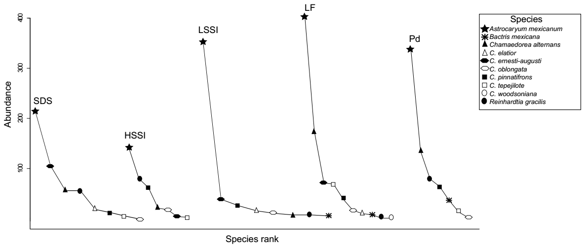 Figure 2 Species-rank curves based on species abundance for palm community present in the land units of Los Tuxtlas Tropical Biology Station reserve, SE Mexico. In the X-axis, species are ranked in decreasing order of their abundance, while in the Y-axis, the number of palms is indicated. HSSI (High Altitude Slopes Strongly Inclined), LSSI (Low Altitude Slopes Strongly Inclined), LF (Lava Flows), PD (Piedmont), SDS (Steeply Dissected Slopes).