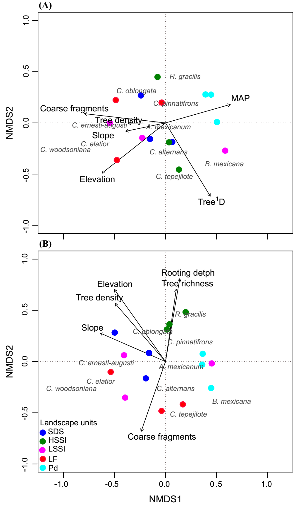 There were distinct distribution patterns in palm assemblages among the LUs. Results from the PERMANOVA showed significant effects of slope of relief (P = 0.009), elevation (P = 0.002), MAP (P = 0.04), soil coarse fragments (P = 0.002), and tree D1 (P = 0.008; Table 3) on palm species presence. These results clustered the plots with low inclination (PD) and separated them from the LUs with abrupt relief and higher elevation, as visualized by NMDS (stress value 0.15) in Figure 3A. Species that responded to this gradient are Bactris mexicana Mart., which was registered mainly in low-inclination plots, while C. ernesti-augusti and C. elatior Mart. were found mostly in plots with abrupt relief (Table S2, Supplementary material). We found that 33 % of the variation in palm species presence was explained by topography since relief elevation and slope explain 21 and 12 %, respectively (Table 3). Coarse fragments in soil and tree diversity (1D) accounted for 25 and 13 % of the variation, respectively.