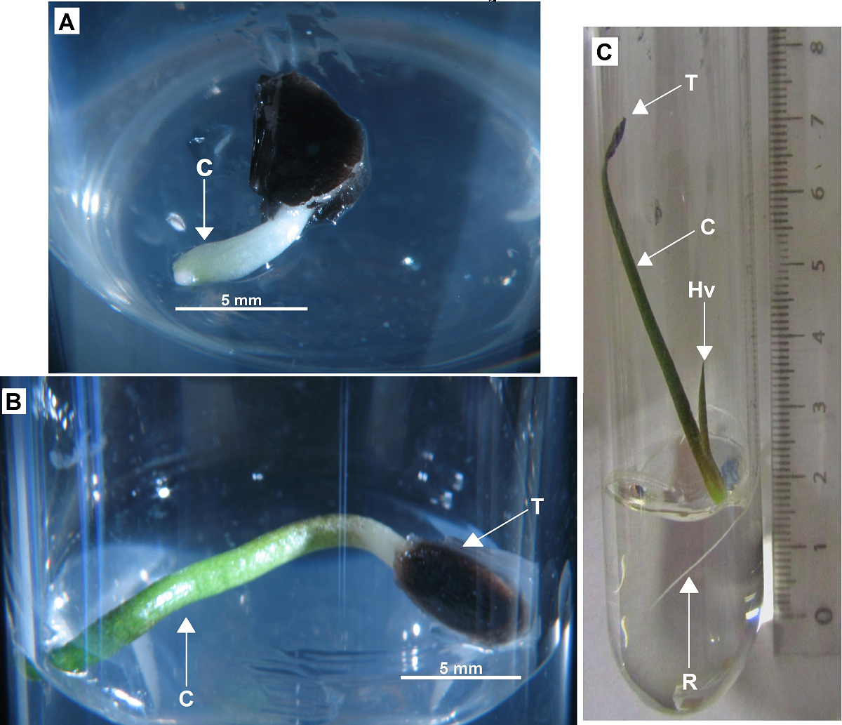 Figura 1 Semillas de Agave potatorum en diferentes etapas de germinación in vitro y desarrollo de la plántula a los 27 días de la siembra. A) cotiledón, fue la estructura que emergió primero y pronto se volvió verde; B) cotiledón elongado; C) plántula con cotiledón, raíz y la primera hoja verdadera. T: testa; C: cotiledón; R: raíz; Hv: hoja verdadera.
