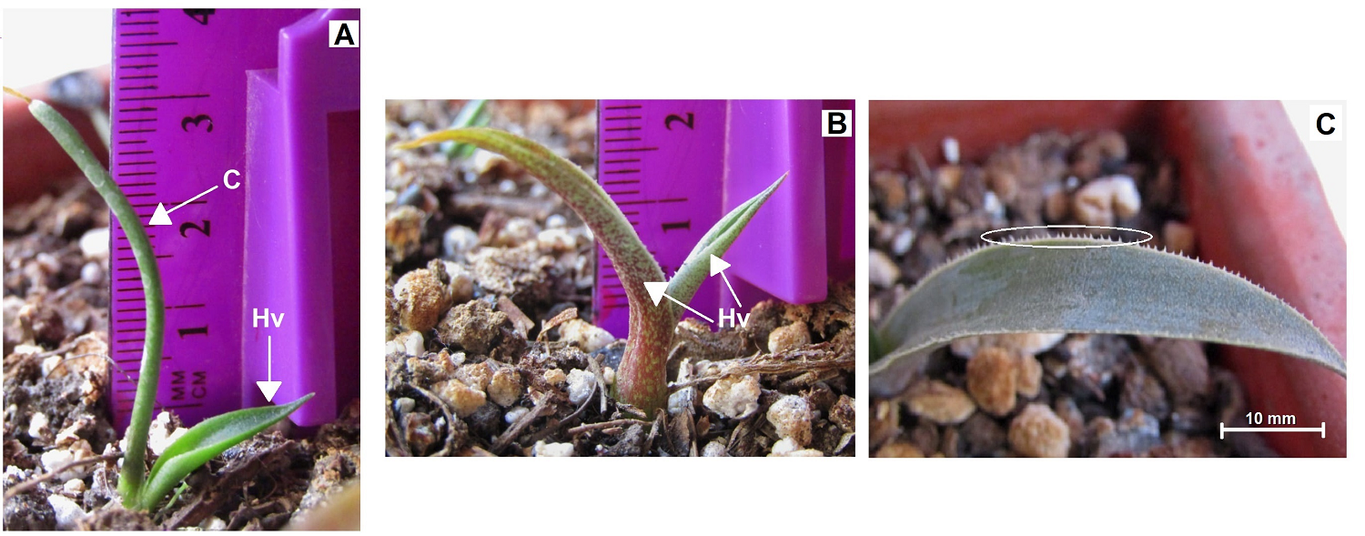 Figura 3 Plántulas de Agave potatorum en condiciones ex vitro a 12 meses de la siembra de semillas. A) el cotiledón permanece verde como un órgano fotosintético; B) hojas verdaderas sin la presencia del cotiledón, el cual se degradó; C) espinas en los bordes de una lámina foliar. C: cotiledón y Hv: hoja verdadera.