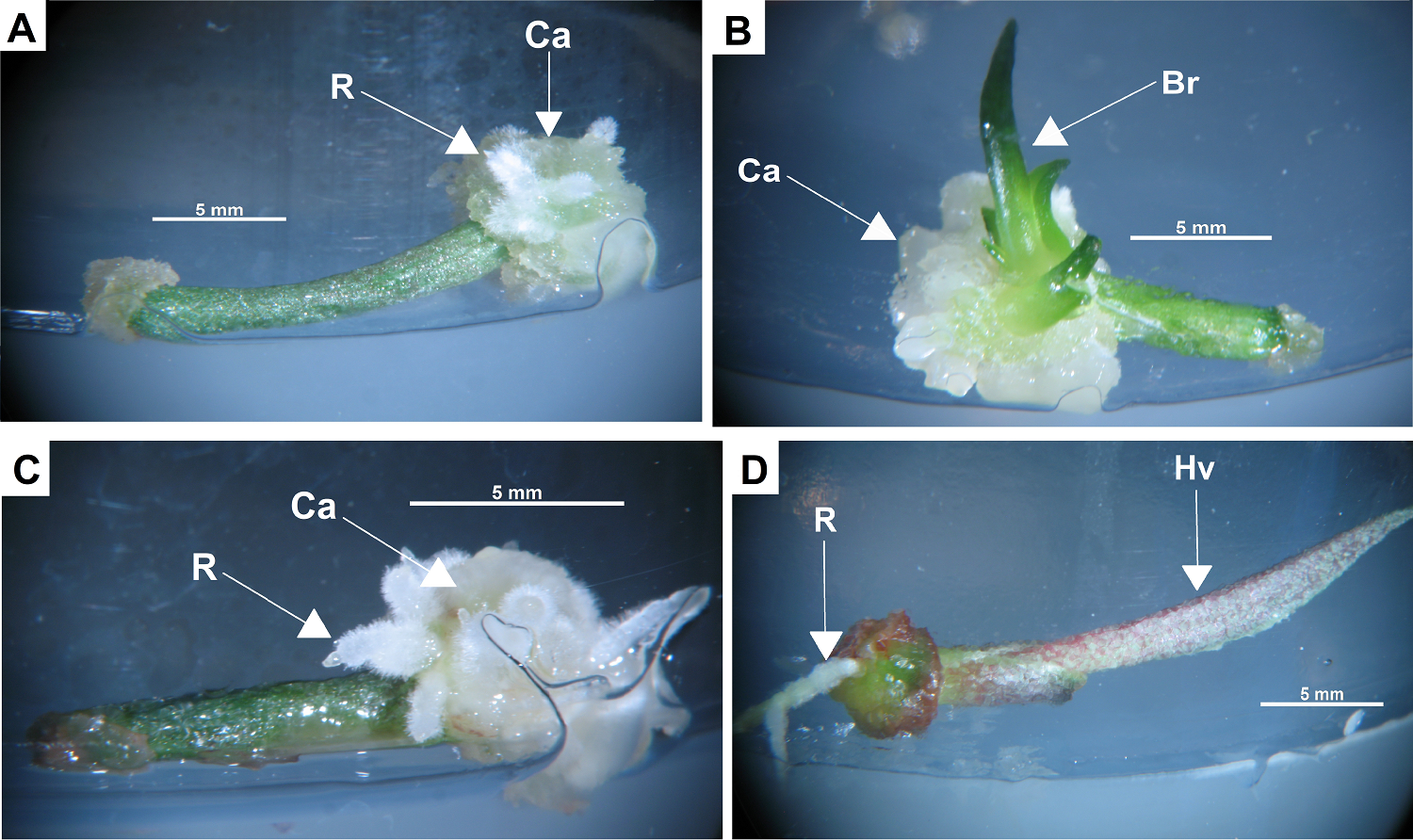 Figura 4 Respuestas a 30 días después de la inducción. Tratamiento 2 (BAP 1.5 mg/L con 2,4-D 0.5 mg/L): A) callo y raíces emergiendo de un explante de cotiledón; B) callo y brotes emergiendo de un explante de tallo. Tratamiento 3 (BAP 2 mg/L con 2,4-D 0.5 mg/L); C) explante de tallo con callo y raíces en uno de sus extremos. Tratamiento control: D) explante de tallo con raíces y una hoja. R: raíz; Ca: callo; Br: brote; Hv: hoja