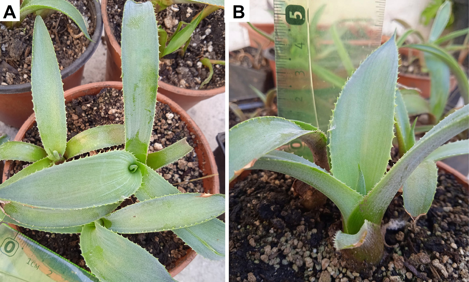 A 12 meses de la siembra, las plantas presentaron raíces de 4-5 cm de largo, de 2-4 hojas verdes, expandidas de una longitud de 4-5 cm, en los márgenes de las hojas se observaron espinas (Figura 2).