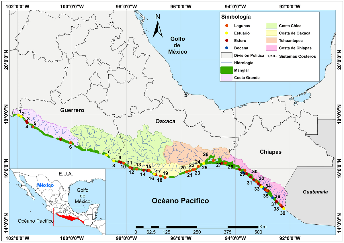 De acuerdo con las clasificaciones realizadas para sistemas costeros mexicanos, la costa del Pacífico sur, bajo un criterio geomorfológico, pertenece a la región D propuesta por Lankford (1977), que va desde Mazatlán hasta el río Suchiate. El Pacífico sur se caracteriza por tener una planicie costera estrecha (algo más ancha hacia el noreste y sureste), debido a la cercanía de las sierras Madre del Sur y Madre de Chiapas; presenta varios ríos perennes y estacionales en cuencas de drenaje relativamente pequeñas, en donde muchas corrientes pierden completamente su caudal durante el estiaje. Bajo el criterio morfotectónico propuesto por Carranza-Edwards et al. (1975), el Pacífico sur correspondería a las unidades VIII, que incluye a las costas de Guerrero y Oaxaca hasta el río Tehuantepec; y la IX que va desde los sistemas lagunares del istmo de Tehuantepec hasta la desembocadura del río Suchiate en la costa de Chiapas.