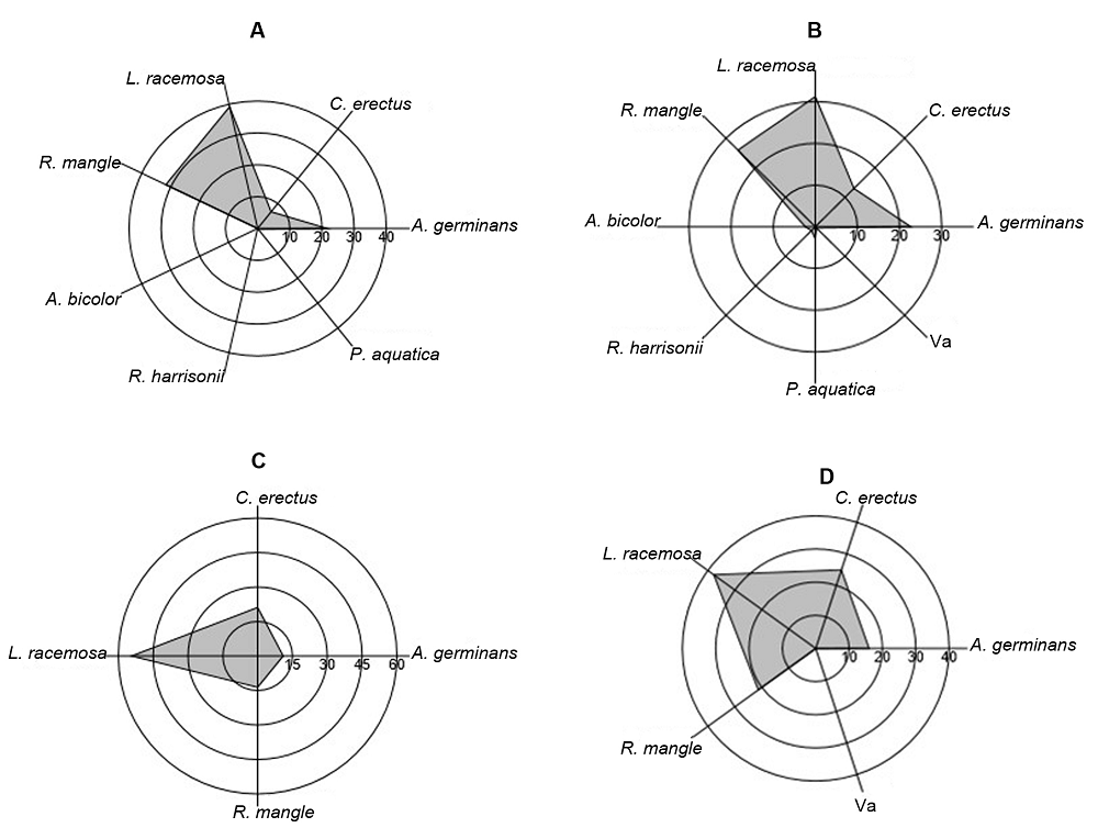 Figura 3 Gráficos de la dominancia global basada en el valor de importancia de las especies de manglar presentes por geoforma en el Pacífico sur mexicano. Bocana (A), Estero (B), Estuario (C), Laguna (D); Ab: Avicennia bicolor, Ag: Avicennia germinans, Ce: Conocarpus erectus, Lr: Laguncularia racemosa, Pa: Pachira aquatica, Rh: Rhizophora harrisonii, Rm: Rhizophora mangle, Va: Vegetación asociada.