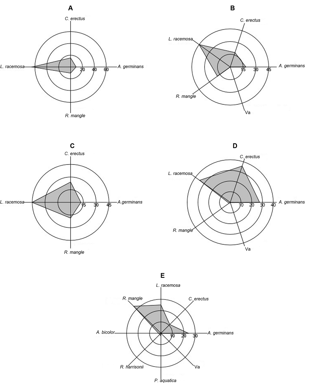 Figura 4 Gráficos de la dominancia global basada en el valor de importancia de las especies de manglar presentes por región hidrológica en el Pacífico sur mexicano. Costa Grande (A), Costa Chica (B), Costa de Oaxaca (C), Tehuantepec (D), Costa de Chiapas €; Ab: Avicennia bicolor, Ag: Avicennia germinans, Ce: Conocarpus erectus, Lr: Laguncularia racemosa, Pa: Pachira aquatica, Rh: Rhizophora harrisonii, Rm: Rhizophora mangle, Va: Vegetación asociada.