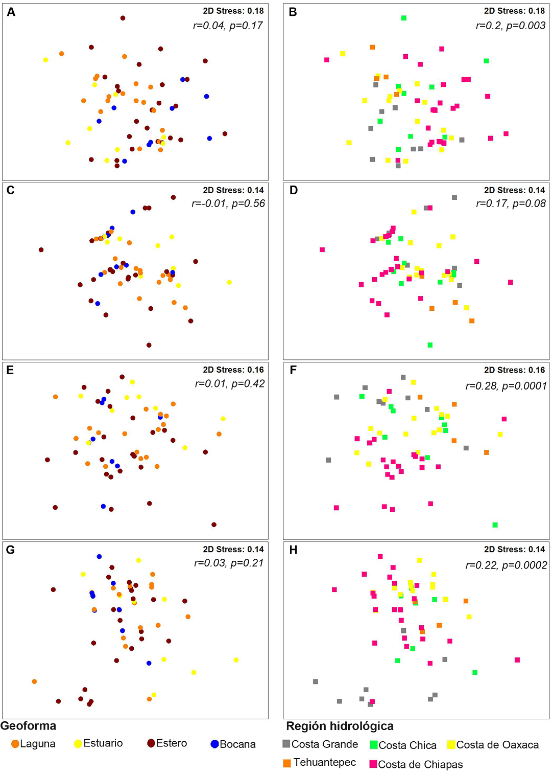 Figura 5 Diagramas de escalamiento multidimensional no paramétrico del área basal (A-B), altura (C-D), densidad (E-F) e ICH (G-H) de las especies de mangles del Pacífico sur mexicano, basados en matrices de distancia. Cada punto representa observaciones categorizadas por geoforma y región hidrológica. Se muestra el valor del coeficiente global r y su significancia estadística (α = 0.05) de acuerdo a los análisis multivariados de similitud.