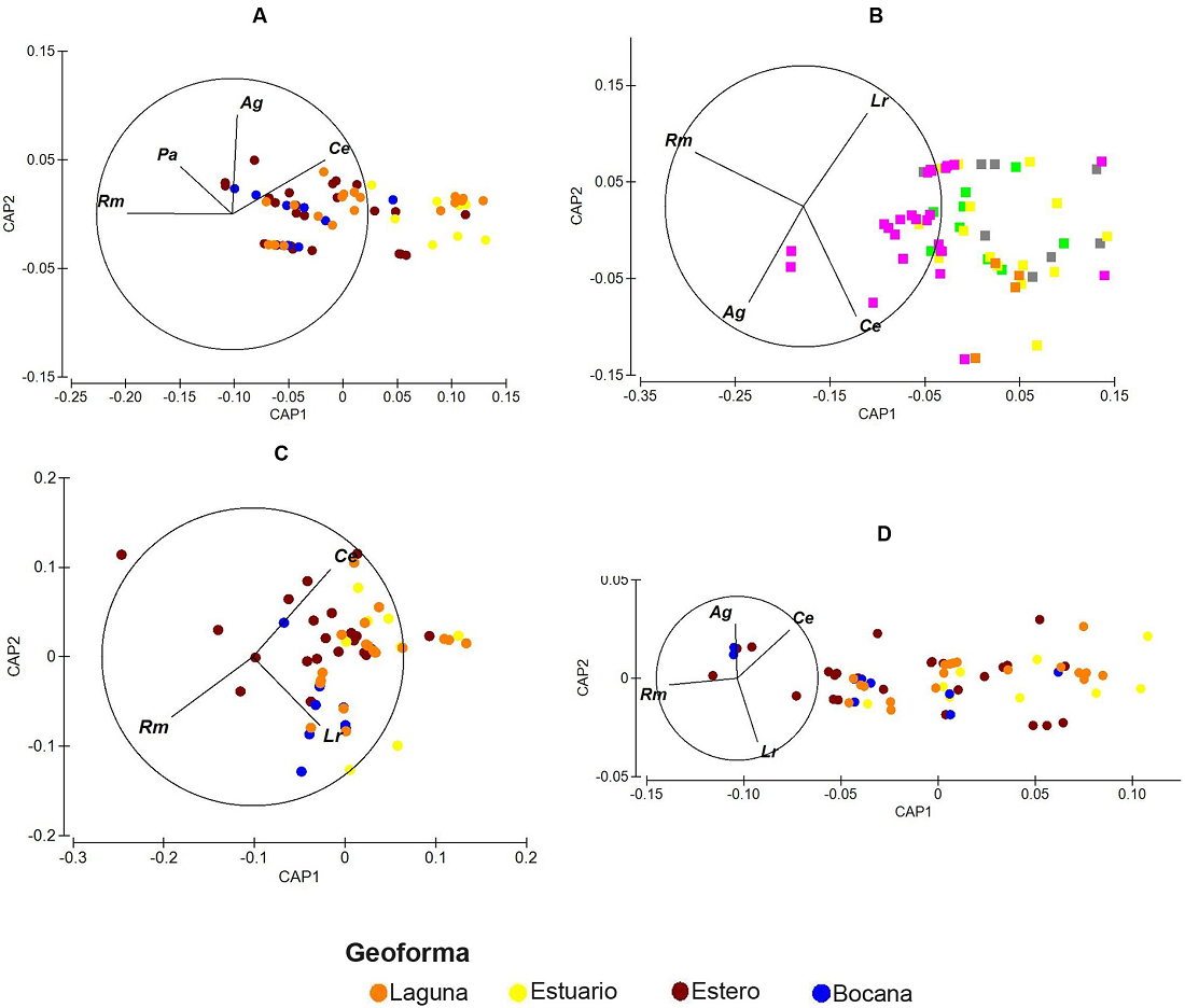 Finalmente, se exploró la consistencia de los patrones de área basal, altura, densidad e ICH de las unidades de muestreo y su potencial predictivo entre geoformas y regiones hidrológicas, a través de análisis canónicos de coordenadas principales (CAP, por sus siglas en inglés) (Anderson & Willis 2003) con pruebas de validación cruzada (LOOCV, por sus siglas en inglés). Los ejes de las ordenaciones construidas fueron correlacionados (Coeficientes de Pearson > 0.5) con los valores de importancia de las especies de mangle, transformados logarítmicamente (Log X +1). Todos los análisis estadísticos multivariados se realizaron siguiendo rutinas del programa PRIMER v. 6 + PERMANOVA (Anderson et al. 2008).