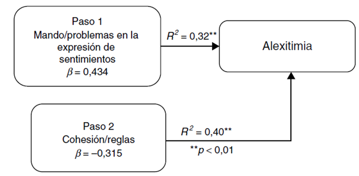En el primer paso se incorporó como predictor en la ecuación mando problemas en la expresión de sentimientos, que explicó el 32% de la varianza F (1, 156) = 74.005, p < 0.01. En el segundo paso se incluyó como predictor cohesión/reglas, con lo que se explicó el 40% de la varianza F (2, 155) = 52.318, p < 0.01. En la Figura 1 se presenta el modelo de regresión.