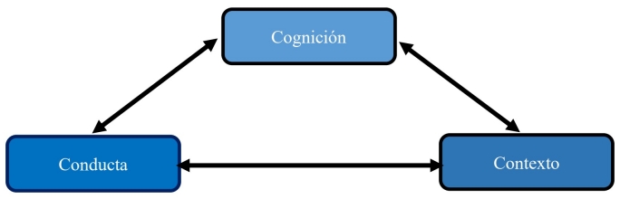 El estudio del comportamiento en los modelos del aprendizaje ha tenido propuestas que han sido consideradas como radicales al considerar que las causas del comportamiento se encuentran solo en factores ambientales y no en el organismo, evitando así propuestas teóricas sobre funciones cognitivas en el ser humano20. Bandura propone la teoría del aprendizaje social21 en ella explica como la función psicológica se desarrolla en la persona formulando términos que describen interacciones reciprocas continuas entre condiciones del ambiente y la conducta ejecutada por el individuo que en la dinámica interactiva incide sobre estas condiciones ambientales permitiendo un aprendizaje. Esta propuesta plantea un énfasis en el rol de la relación vicaria entre lo simbólico y el proceso de autorregulación como manifestación de lo psicológico.