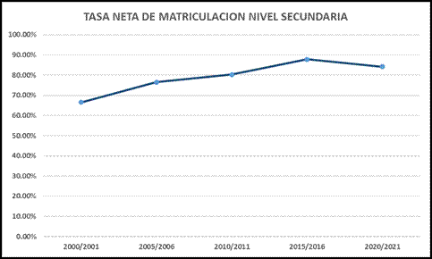 Para el caso del nivel de secundaria, se presenta una considerable reducción en la tasa neta de matriculación en los últimos 20 años. En el ciclo escolar 2000-2001, se encontraba en el 66.5%. Aunque este indicador ha mostrado un aumento a lo largo del tiempo, llegando al 87.9% en el ciclo escolar 2015-2016, para el ciclo escolar 2020-2021 volvió a disminuir, alcanzando un valor de 84.2%, como se muestra en la Figura 3.
