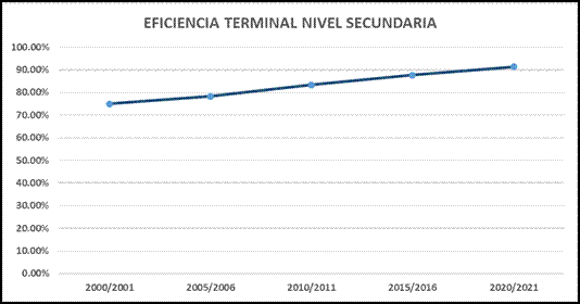 En referencia a la eficiencia terminal para el nivel de secundaria, también ha estado en constante crecimiento durante los últimos 20 años, como se muestra en la Figura 4, alcanzando un 91.4% de alumnos para el ciclo escolar 2020-2021. Desafortunadamente, en comparación con el nivel de primaria, la matrícula en los niveles de secundaria es mucho menor. En el ciclo escolar 2015-2016, se tenía una matrícula de 6,835,245 alumnas y alumnos, pero para el ciclo escolar 2020-2021, la matrícula de alumnos disminuyó a 6,394,720.