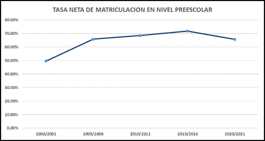 En cuanto a asegurar el acceso a la educación preescolar de calidad para todas las niñas y niños, además del desarrollo en la primera infancia, lo cual se refiere a la meta 4.2, el indicador de la tasa de matriculación neta ha mostrado bajos niveles durante los últimos 20 años. El mayor nivel registrado fue durante el ciclo escolar 2015-2016, con apenas el 71.8%, pero ha disminuido nuevamente para el ciclo 2020-2021, alcanzando el 65.6%, como se muestra en la Figura 5.