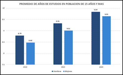 La Figura 9 muestra que, en México, del año 2010 al 2020, el promedio de años estudiados escolarmente por personas de 15 años y más en los diferentes sistemas educativos pasó de 8.63 años a 9.84 años. Se observa una marcada igualdad de oportunidades entre hombres y mujeres, ya que para el año 2020, el INEGI registra que los hombres mayores de 15 años estudian en promedio 9.84 años, mientras que las mujeres de 15 años y más estudian en promedio 9.64 años.
