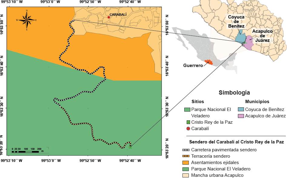 El ANP con categoría de Parque Nacional El Veladero, comparte su territorio con los municipios de Acapulco de Juárez y de Coyuca de Benítez (Figura 1). El área de estudio es un sendero que parte del ejido el Carabalí, localizado en el municipio de Acapulco de Juárez, y recorre parte de la ANP (Anzaldúa-Soulé y col., 2021).