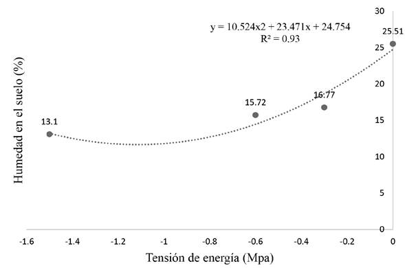 De acuerdo a la curva de abatimiento de humedad, determinada por el método de la olla de membrana (Richards 1948), la capacidad de campo (CC) del suelo del área experimental es de 25.5% de humedad edáfica; en tanto que el punto de marchitez permanente (PMP) fue de 13.1% (Figura 1). Las constantes de humedad de CC y PMP, fueron el referente para establecer los contenidos de humedad probados en este estudio (muy favorable, favorable y desfavorable), especificando que el nivel desfavorable (10-15%) se llevó en su nivel mínimo, por debajo del PMP identificado, en la presunción de que la planta pudiera entrar a una condición de estrés, considerando que el nopal es una especie suculenta que evade el estrés hídrico a base de conservar apotenciales hídricos altos dentro de sus tejidos (Pedroza 1995).