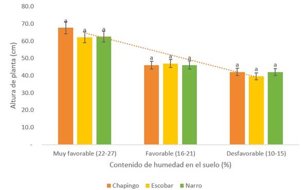 El ancho y grosor del cladodio no variaron entre variedades en el contenido de humedad desfavorable (10-15%), pero en los contenidos de humedad muy favorable (22-27%) y favorable (16-21%), la variedad Chapingo fue significativamente mayor (P ≤ 0.05), con valores de 15.7 y 1.1 cm y 15.2 y 1.0 cm, respectivamente. Las variedades Escobar y Narro, fueron estadísticamente menores para estas dos variables y sin diferencia estadística entre ambas. La longitud de cladodio (Tabla 1) y altura de la planta (Figura 2), no mostraron ningún efecto por variedad en los diferentes contenidos de humedad del suelo probados en este estudio.