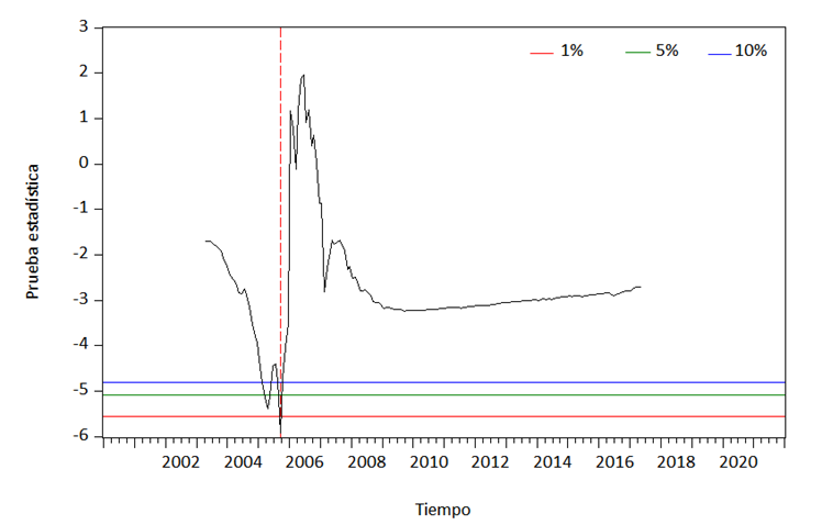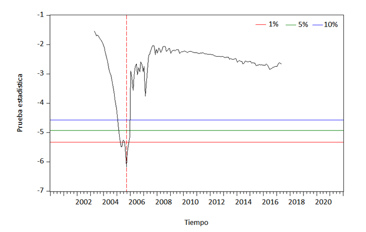Por su parte, la prueba de Zivot y Andrews (1992) rechaza la hipótesis nula de raíz unitaria sin cambio estructural en los tres Modelos A, B y C (Cuadro 8). Se concluye que la serie presenta cambios estructurales endógenos. Es decir, la serie presenta con significancia al 1% un posible cambio estructural con fecha de mayo de 2011 en el nivel de la serie, un cambio de tendencia en mayo de 2016 y un cambio de nivel y tendencia en enero de 2017.
