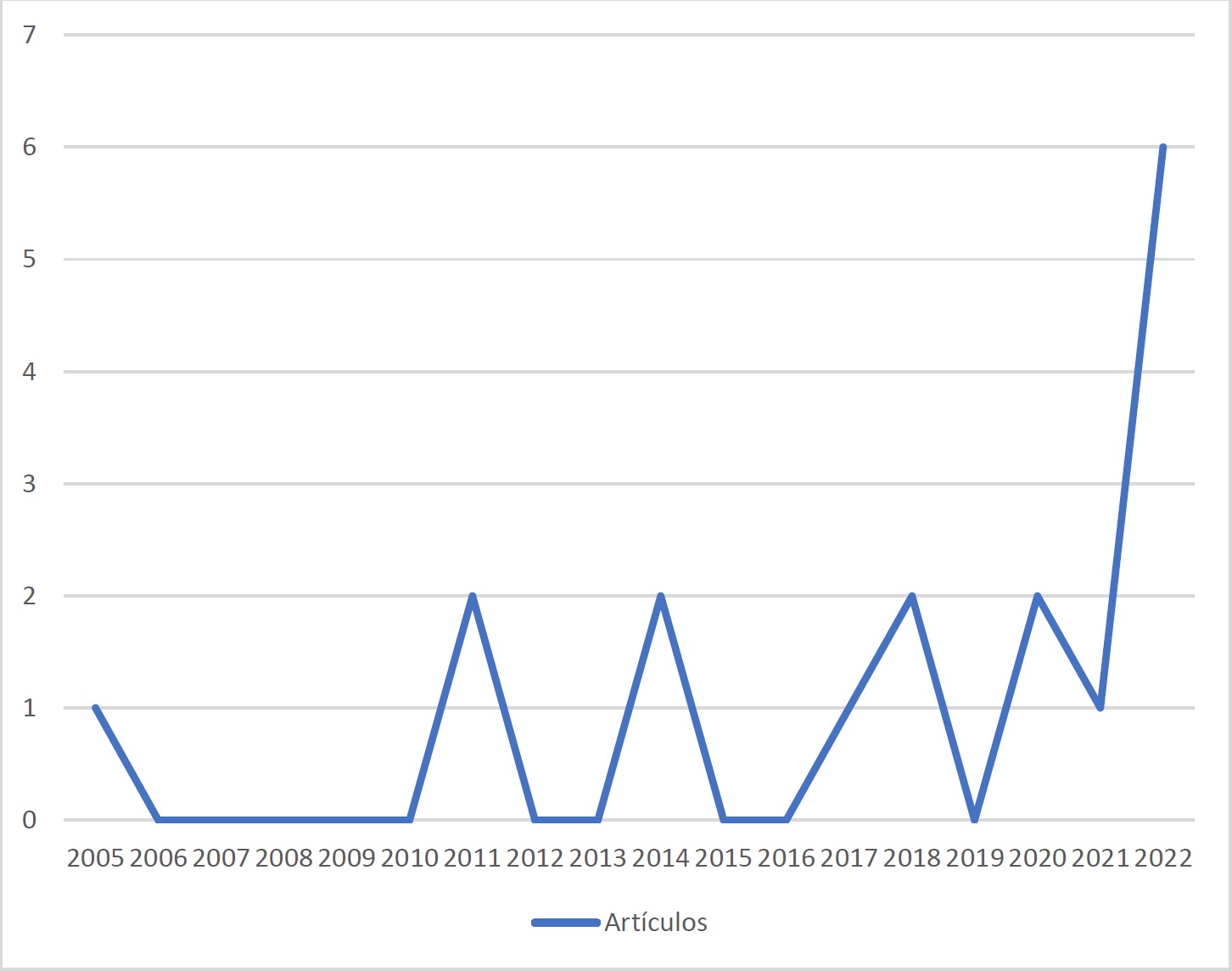 Dentro del ámbito de la Comunicación, en Scopus se encuentran artículos del área de las relaciones públicas, publicidad, marketing, periodismo, análisis de medios y análisis de discurso. Para efectos de este artículo, se revisó la producción científica en español del área de Periodismo, Análisis de Medios y Análisis de Discurso. Se encontró un total de 17 artículos, con una tendencia claramente al alza a partir de 2021.
