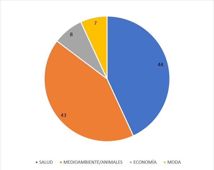Los argumentos sobre veganismo/vegetarianismo encontrados se pueden clasificar, en rasgos generales, en los siguientes cuatro temas: alusiones a la salud; alusiones al medioambiente (incluyendo el bienestar animal); alusiones a la economía; alusiones al veganismo como movimiento (si es una moda o no). Al agrupar y contabilizar los argumentos, se observa un empate entre argumentos sobre salud y sobre medioambiente/bienestar animal. Los argumentos sobre economía y sobre el movimiento en sí, también empatados, son menos numerosos.