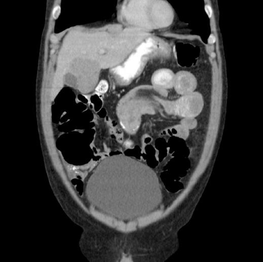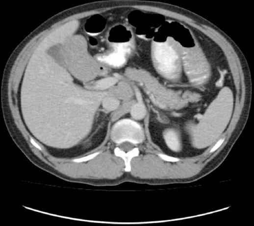 Varón de 53 años procedente de Bogotá, Colombia, quien consultó al servicio de urgencias del Hospital Universitario San Ignacio por un cuadro clínico de 15 días de evolución consistente en dolor abdominal localizado en el hipocondrio derecho, de baja intensidad, el cual se exacerbó 4 días antes de la consulta y se acompañaba de múltiples episodios eméticos y ausencia de deposiciones. El paciente negaba otra sintomatología asociada. En la exploración física se encontraron signos vitales normales, sin alteraciones a la auscultación cardiopulmonar. La valoración abdominal evidenció ruidos intestinales presentes, con leve dolor a la palpación periumbilical y sin signos de irritación peritoneal. No se evidenciaron defectos herniarios ni se palparon masas.