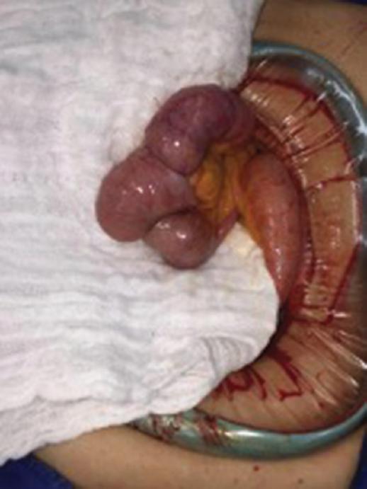 Con estos hallazgos se decidió programar para laparotomía exploratoria, en la que se encontró, a 100 cm del ligamento de Treitz, una masa redondeada dependiente del yeyuno, de aproximadamente 4 cm, que condicionaba una intususcepción yeyuno-yeyunal (Fig. 4) con asas de yeyuno proximal dilatadas y distales colapsadas. Se realizó una resección intestinal segmentaria con sutura mecánica y se efectuó una anastomosis yeyuno-yeyunal termino-terminal con sutura mecánica. Seguidamente se hizo una revisión sistemática de la cavidad abdominal, encontrando una masa en el hilio hepático, en relación con el borde medial de la vesícula biliar, de aproximadamente 4 × 5 cm, multilobulada, en contacto con los segmentos IV y V del hígado, de la cual se tomaron muestras para estudio histopatológico.