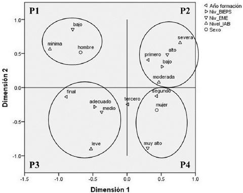 Se identificaron las características sociodemográficas de la muestra y se analizaron diferencias en empatía, ansiedad y bienestar psicológico entre sexos y año de formación mediante ANOVA bifactorial sexo × año de formación, la prueba post hoc de la diferencia honestamente significativa (DHS) y la ηp2 como índice del tamaño del efecto (efecto pequeño, mediano y grande: ηp2 ≥ 0.01, 0.06 y 0.14, respectivamente25). Para identificar subgrupos con niveles diferenciados de empatía, con los datos de la EME se realizó un análisis de conglomerados mediante una técnica jerárquica con la distancia euclídea al cuadrado y el método de agrupamiento de Ward. Los subgrupos fueron formados por la inspección del dendograma y se validaron mediante pruebas ANOVA unifactorial, DHS y ηp2. Se identificaron prevalencias para nivel de empatía, ansiedad y bienestar psicológico. Se realizó un análisis de correspondencias múltiples con una estructura bidimensional identificada por el valor de las medidas de discriminación (MD). Se empleó el programa SPSS v.20.