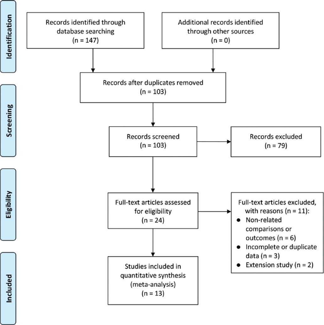 According to the search strategy, a total of 147 electronic records were retrieved, including 49 from PubMed, 57 from Embase, and 41 from Cochrane. After using Endnote X9 software and manually removing 44 duplicate records, 79 irrelevant papers were excluded by browsing titles and abstracts. By reading the full text, 11 papers with irrelevant outcome indicators, unrelated comparison strategies, incomplete data, or extended similar studies were removed. Finally, 13 papers were included in the meta-analysis, and the results of the literature screening process are shown in figure 1.