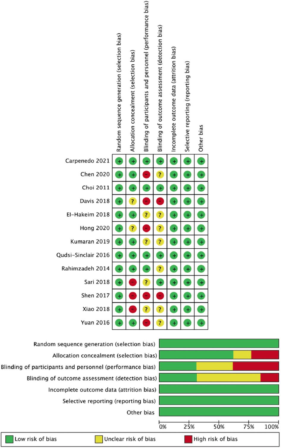 Detailed information about the risk of bias is shown in figure 2. Quality assessment of the literature was conducted using the cochrane collaboration tool. All studies clearly reported methods of random sequence generation, and most studies (61.5%) described allocation concealment methods. Some trials obtained unclear or high-risk bias due to open-label or single-blind measures for participants and executors, only four studies explicitly mentioned conducting double-blind research, and many studies did not provide explicit descriptions for outcome indicator blinding. All RCTs did not have incomplete outcome data, apparent selective reporting, or other biases.