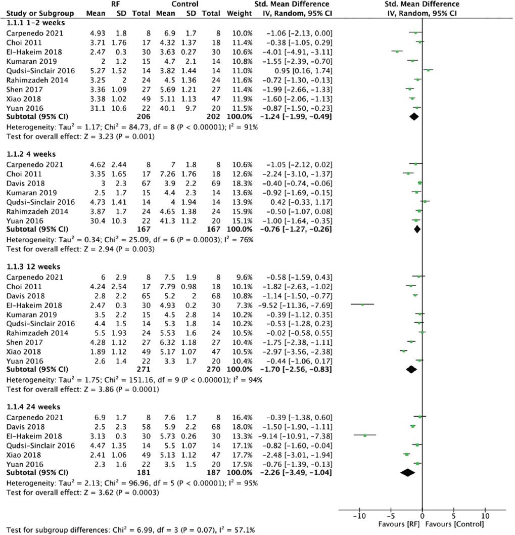All 13 studies reported post-treatment pain scores. Among them, 9 studies reported pain scores 1-2 weeks after treatment, 7 studies reported pain scores 4 weeks after treatment, 10 studies reported pain scores 12 weeks after treatment, and 6 studies reported pain scores 24 weeks after treatment. Compared with the control group, the pain scores of the patients in the RFA group significantly reduced at 1-2 weeks, 4 weeks, 12 weeks, and 24 weeks after treatment, with SMDs of −1.24 (95% CI: −1.99-−0.49; p = 0.001; I2 = 91%), −0.76 (95% CI: −1.27-−0.26; p = 0.003; I2 = 76%), −1.70 (95% CI: −2.56-−0.83; p = 0.0001; I2 = 94%), and −2.26 (95% CI: −3.49-−1.04; p = 0.0003; I2 = 95%), respectively (Fig. 3).