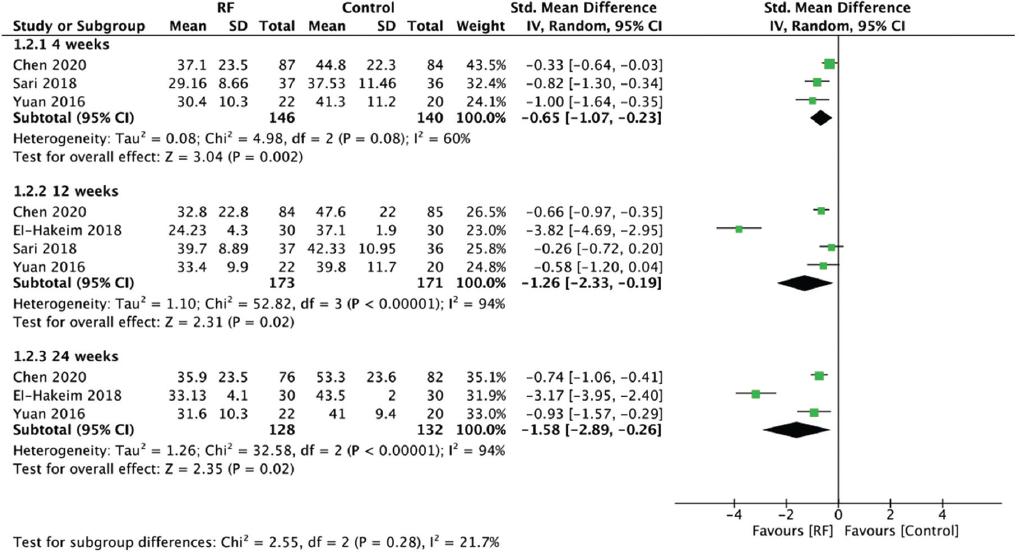Three, four, and three studies, respectively, evaluated the changes in the WOMAC index at 4 weeks, 12 weeks, and 24 weeks after treatment. The results showed that compared with the control group, the WOMAC index of the RFA group was lower. The pooled SMDs were −0.65 (95% CI: −1.07-−0.23; p = 0.002; I2 = 60%), −1.26 (95% CI: −2.33-−0.19; p = 0.02; I2 = 94%), and −1.58 (95% CI: −2.89-−0.26; p = 0.02; I2 = 94%), respectively (Fig. 4).