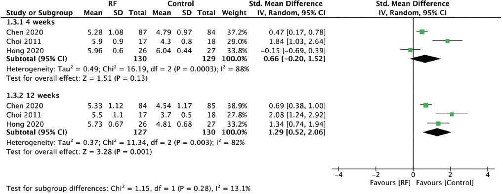 Three studies each reported the comparison of the GPE scores of the two groups of patients after treatment. Compared with the control group, RFA significantly improved patient satisfaction 12 weeks after treatment, but there was no significant difference 4 weeks after treatment. The pooled SMDs were 1.29 (95% CI: 0.52-2.06; p = 0.001; I2 = 82%) and 0.66 (95% CI: −0.20-1.52; p = 0.13; I2 = 88%), respectively (Fig. 5).
