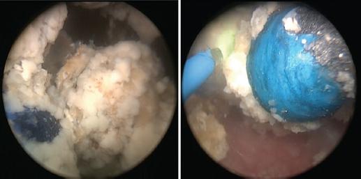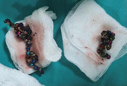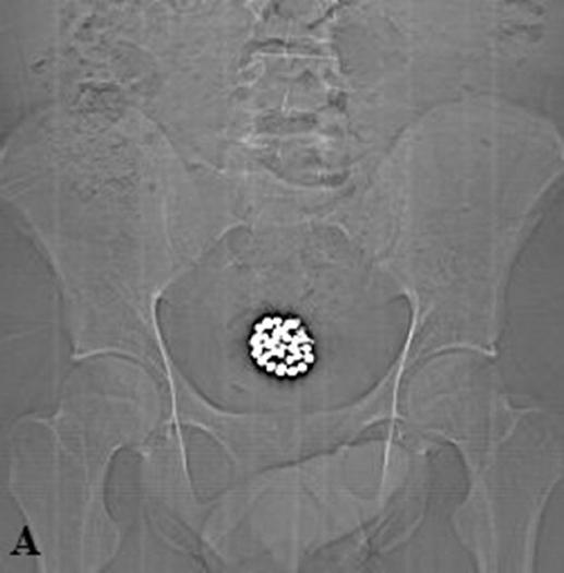 A 15-year-old healthy male adolescent applied to a urologist immediately after seeing blood in his urine. He has also confessed to groin pain, dysuria, and foul-smelling urine for 6 months. Vital signs and physical examination were insignificant other than a mild suprapubic tenderness to palpation. Laboratory blood test results were normal. The urinary sediment showed > 80 white blood cells/μL and > 5 red blood cells/μL. X-ray, ultrasonography (USG), and computed tomography (CT) were performed, respectively (Figs. 1-3) (supplementary material 1). Cystoscopy was planned for the optimal diagnosis and treatment. Under general anesthesia, a cystoscope with a 20 Fr sheath was introduced into the urethra, and a bladder stone was identified in the bladder trigone. After the holmium laser process was started, as the superficial stone layer was removed, a deeply colored core consisting of spheres appeared (Fig. 4) (supplementary material 2).. The superficial stone layer was easily fragmented, but the colorful inner layer was resistant, even though fragmented, the pieces were being reunited. The fragments of the outer stone layer were cleared through the cystoscope, but since the beads and metallic fragments were not split due to the magnetic attraction, withdrawal through the cystoscope or using forceps was impossible. Hence, a small cystotomy was performed through a Pfannenstiel incision, and all the 64 magnetic spheres were removed, some of which were partially fragmented by holmium laser, and the bladder was cleared completely (Fig. 5). The patient´s course in the post-operative period was stable. A preliminary psychological evaluation was administered on the 1st post-operative day. The patient volunteered his story about the magnetic spheres; 9 months ago, out of curiosity, he had sent one sphere through the urethra and used the second one to pick the first one up, thus inserting all 64 beads into the urethra. On the 3rd postoperative day, the drain was removed, and the patient was discharged with a urethral catheter. The catheter was removed on the 1-week follow-up after a cystogram was performed which revealed neither leakage nor any residual contrast (supplementary material 3). The patient recovered without complications.